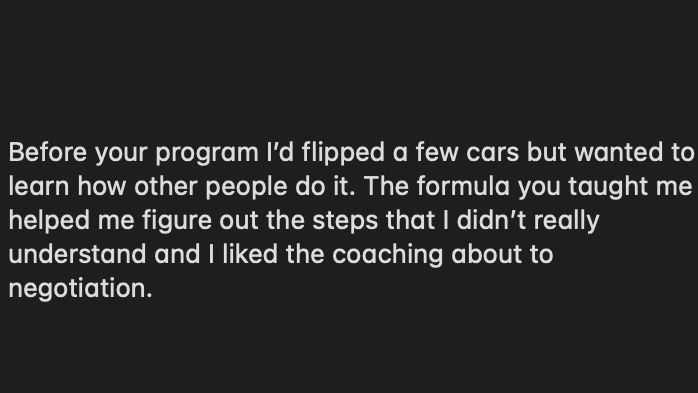 After 6 years, countless cars flipped, $200,000+, and dozens of clients, I’ve stripped flipping down to what really matters, proven strategies that increase the amount of deals you find, get your negotiation skills on point, and make you more money, while cutting years of trial and error.